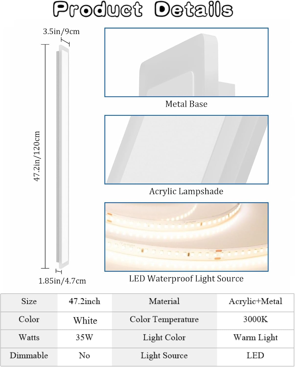 💎【Waterproof & Tough】Built to brave the outdoors, this sleek 47.2-inch wall light is rated IP65, ready to handle rain or shine. Its LED strip and waterproof driver are sealed tight to keep the light shining strong year-round. Plus, with smart features like short circuit protection and overload defense, it’s a dependable glow buddy! 💎【Bright & Energy-Savvy】Packing 3302 lumens while sipping just 35W, it’s way brighter than a 180W bulb but way cooler on your energy bill—up to 80% savings! And it keeps going strong for up to 50,000 hours. 💎【Stylish Vibes】Rocking a frosted acrylic frame with a clean matte white finish, this outdoor sconce turns any wall into a modern masterpiece, casting cozy, inviting light that’s perfect for evenings outside.