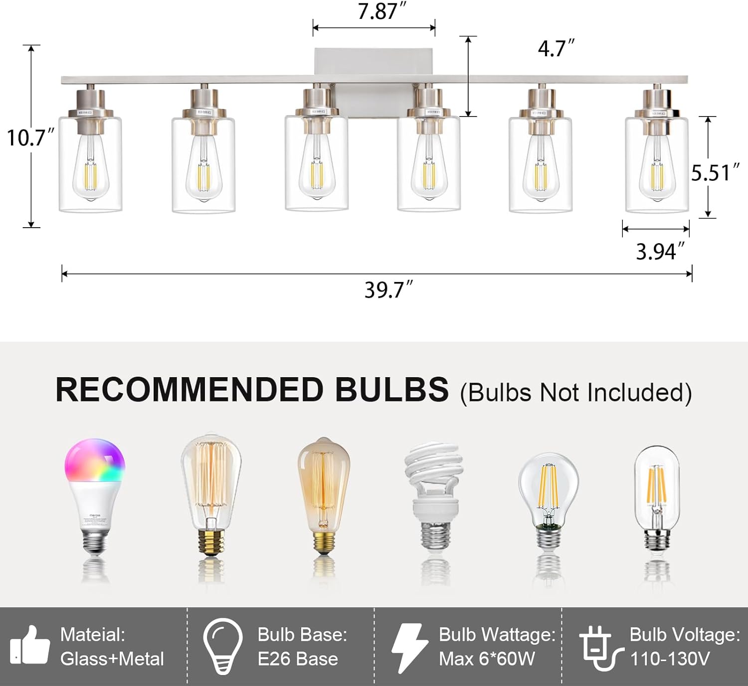 Add a touch of charm with this 6-light bathroom fixture featuring a sleek matte brushed nickel finish and clear glass shades that blend farmhouse vibes with modern flair. It’s perfect not just for your bathroom or vanity mirror, but also for sprucing up your living room, bedroom, or entryway. Installation is a breeze with included mounting gear and easy-to-follow instructions, plus you can mount it whichever way you like—up or down! Compatible with any E26 base bulb up to 60W (bulbs and dimmer switch sold separately) and ready to shine bright or dim down for the mood you want.