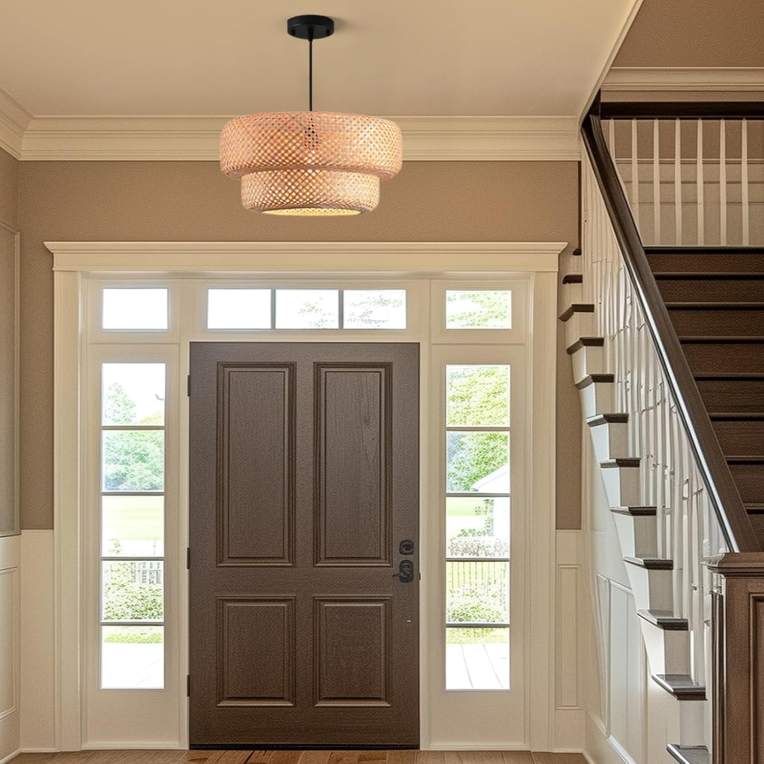 This charming boho pendant light features a unique double-layer bamboo lampshade, hand-woven for durability and a natural, beautiful look—perfect as a thoughtful gift for family or friends. Measuring 14.2 inches wide and 7.9 inches tall, the adjustable 70-inch electric cord lets you customize the height to suit any ceiling style. Its warm, woven bamboo glow adds cozy vibes to your kitchen island, dining room, hallway, or even a favorite café spot, blending both focused and ambient lighting with rustic charm.