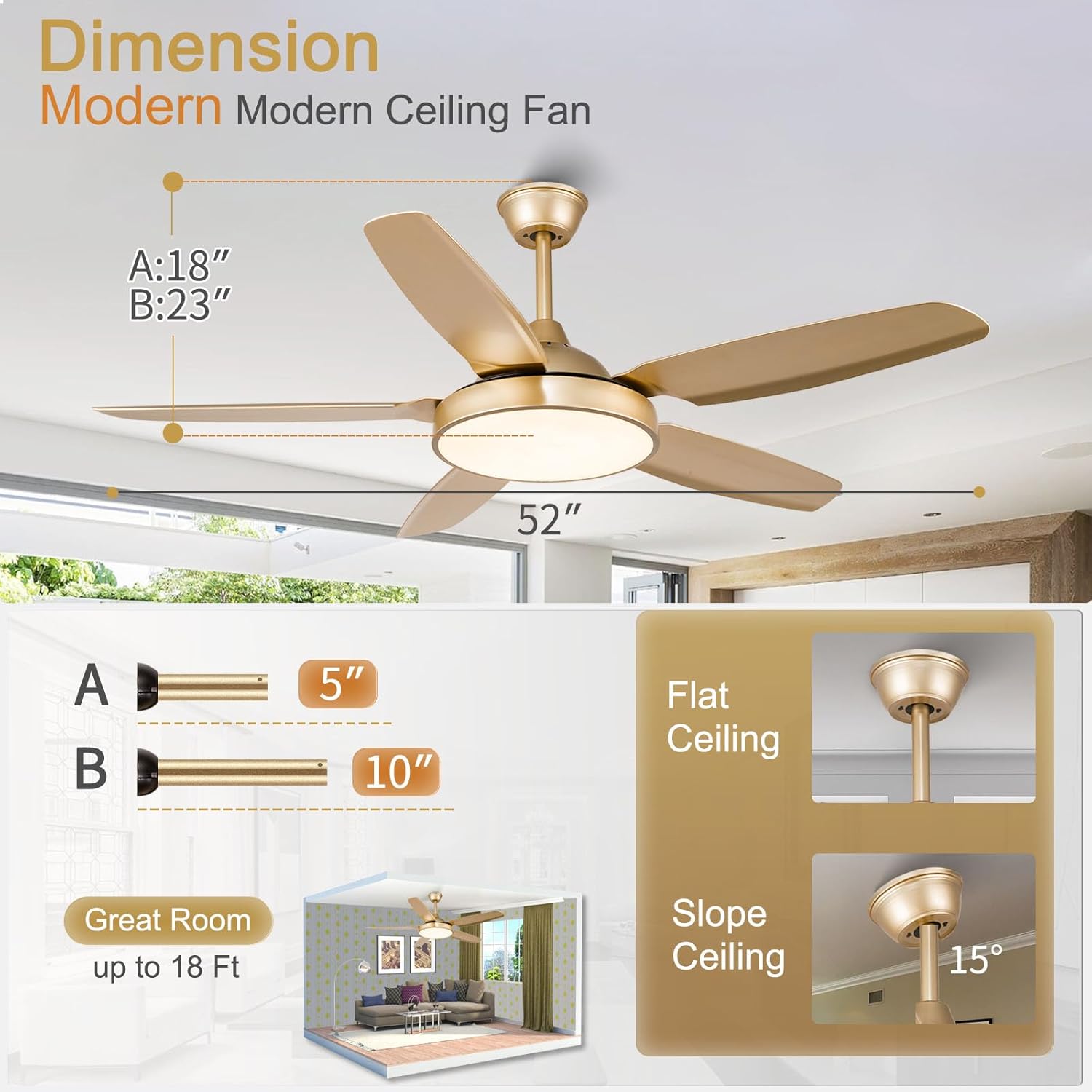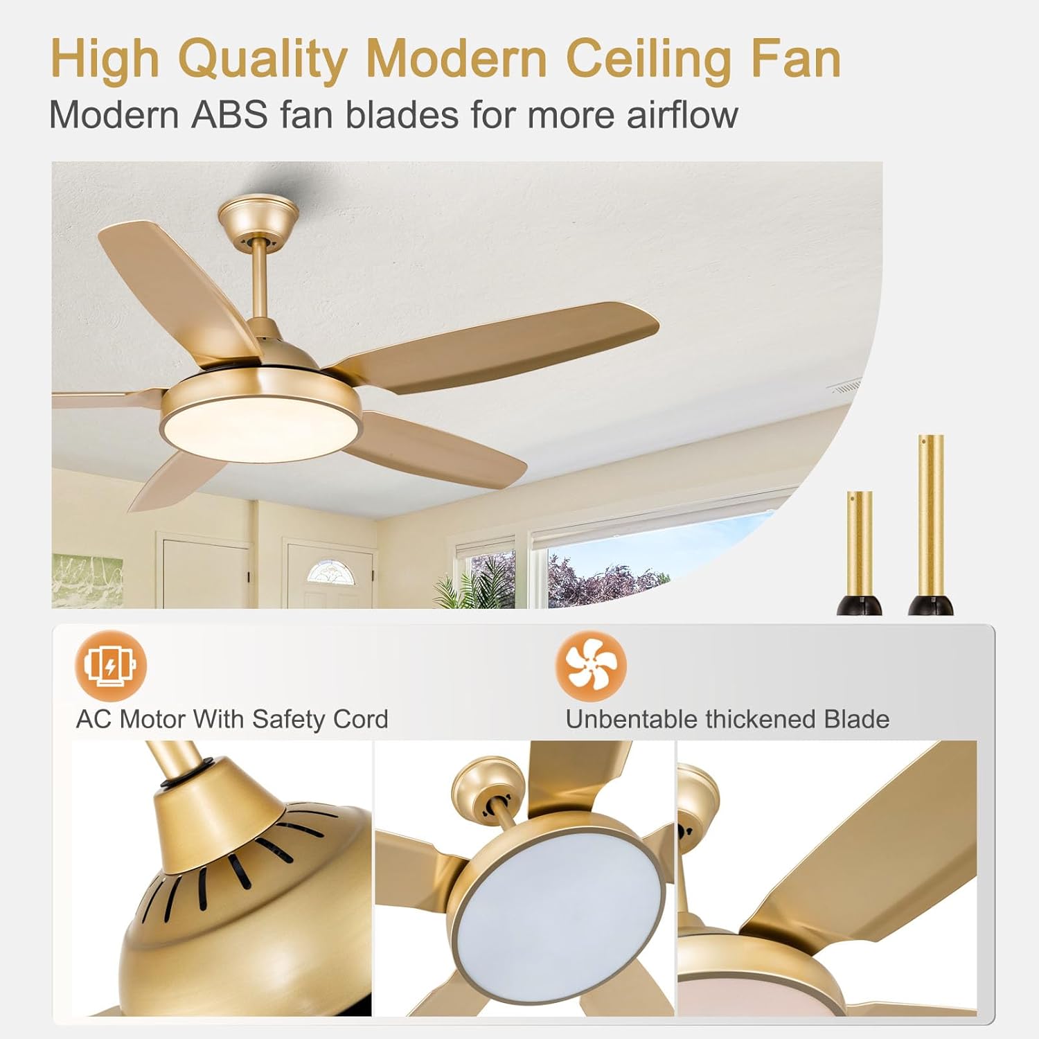 Meet the sparkling Champagne Gold Ceiling Fan—a chic twist on modern comfort! This 52-inch beauty combines a whisper-quiet copper motor with 5 shiny gold blades to deliver a refreshing breeze without stealing the spotlight. Use the stealthy remote to toggle through 6 speeds, reverse airflow for year-round cozy vibes, set timers, and even control the light separately. With adjustable rods and three color temps—from warm glow to bright white—you get the perfect breeze and mood lighting for any room. Cool, cozy, and stylish? Yes, please!