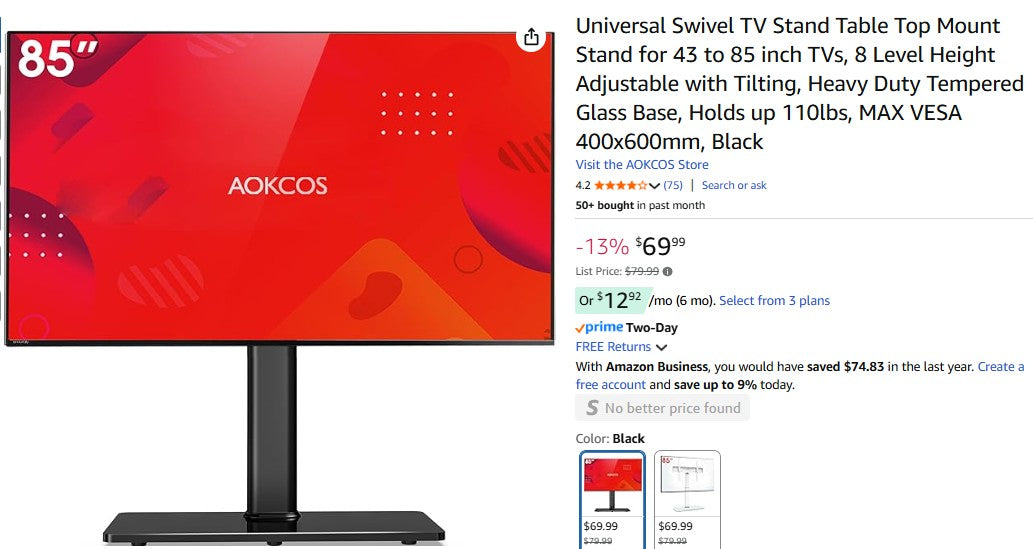This universal swivel TV stand is perfect for big-screen TVs from 43" up to 85", fitting a wide range of VESA patterns—just double-check yours before buying! It features a smooth tilt adjustment from -2° to 10° that’s easy to control with a simple turn of a long screw—no more fiddling with multiple screws! Plus, swivel your TV 25° left or right, and customize height in four steps, with an extra two-step hook adjustment, reaching up to 42". Whether in your living room, bedroom, or office, it’s ready to give you the best view with a touch of fun flexibility.